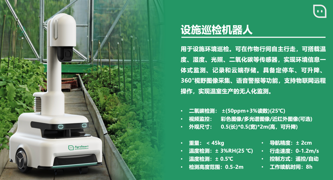设施巡检机器人主要服务于现代化温室大棚、规模化种植等场景,可实现自动化、智能化农作物生长状态、设施环境一体化监测。机器人能够实现环境数据的实时监测报警,及自动化路径规划任务管理与数据查看回溯等功能。环境监测单元集成搭载智能化农作物生长环境监控设备如摄像头、环境传感器等,实时获取多种温室数据。运动控制单元集成搭载了磁导航传感器、激光雷达、环境传感器、摄像头等硬件设备,能够实现智能温室的无人化自动巡检任务。数据监管平台集成多种数据,可实现历史环境数据回溯、场景图片数据回溯、表型数据分析等功能。
