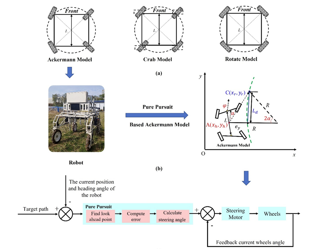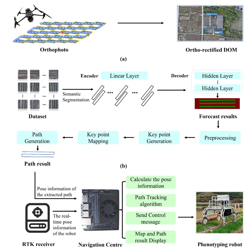 研究人员使用配备实时动态定位(RTK)模块和可见光相机的无人机,对作物种植区域进行航拍,构建高精度数字正射影像图(DOM)。接着,运用 SegFormor-B0 语义分割模型检测作物行,提取关键坐标点,并映射到实际地理坐标,从而生成导航路径。此外,基于纯追踪算法设计自适应控制器,依据机器人当前位置与目标位置的距离、角度偏差和横向偏差,实时动态调整转向角度,确保机器人精准沿路径行驶。